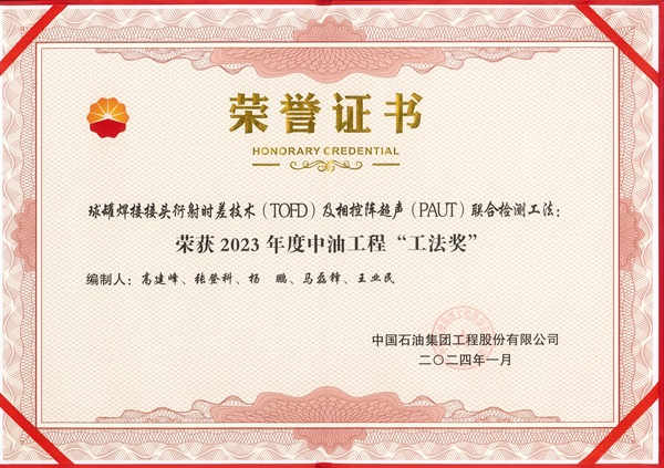 《球罐焊接接頭衍射時(shí)差技術(shù)(TOFD)及相控陣超聲(PAUT)聯(lián)合檢測工法》在2023年10月已經(jīng)被中國石油工程建設(shè)協(xié)會評定為石油工程建設(shè)工法(省部級),本次該工法被評為中油工程2023年度工法獎(jiǎng),是對公司工法質(zhì)量的高度認(rèn)可,同樣也是激勵(lì)工法編制人員,檢測技術(shù)人員要善于總結(jié)技術(shù)成果,不斷提升技術(shù)水平。