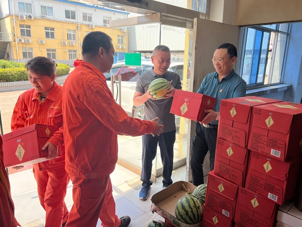 “天氣這么熱,大家辛苦了。要千萬(wàn)注意安全,合理安排工作時(shí)間,盡量避開(kāi)高溫作業(yè),感覺(jué)身體不適,立即休息調(diào)整,不能為了趕進(jìn)度打疲勞戰(zhàn),要在確保安全的前提下工作!”6月13日,洛陽(yáng)地表溫度上升到41度,現(xiàn)場(chǎng)的員工像在“烤箱”中工作,公司經(jīng)理和工會(huì)主席冒著酷暑,深入石化設(shè)備制造檢測(cè)中心車間等現(xiàn)場(chǎng),親切看望慰問(wèn)一線員工,為奮戰(zhàn)在炎熱天氣下的一線員工送去西瓜、清涼飲料等防暑降溫用品,及時(shí)把公司關(guān)懷送到每位員工手中。并圍繞如何做好防暑降溫工作提出了具體要求。